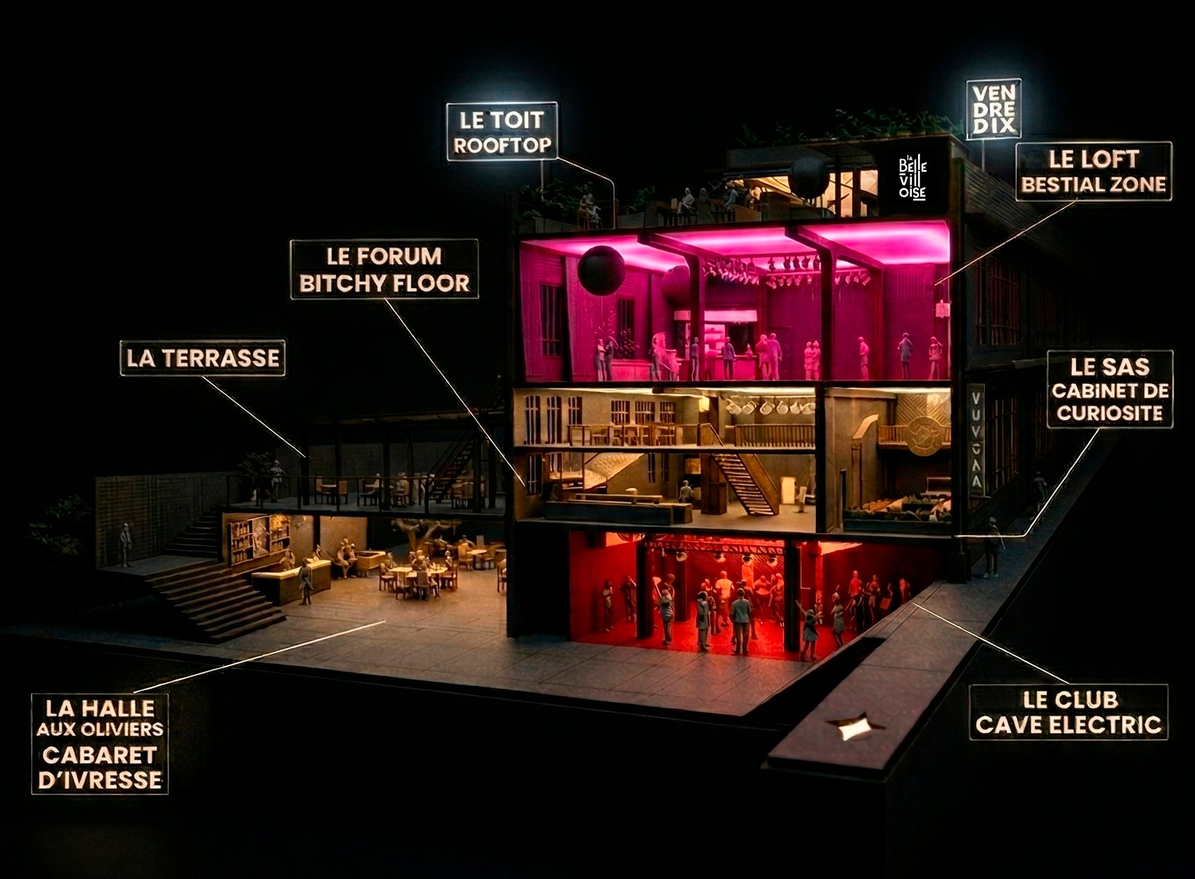 La Bellevilloise accueille VendrediXXL depuis plusieurs années, tous les deuxièmes vendredis de chaque mois, pour une soirée exceptionnelle, dans tous les étages de ce navire de la fête et de la culture du 20ieme arrondissement de Paris.